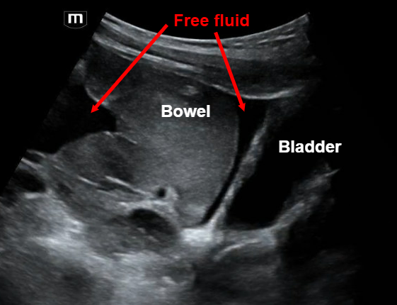 In this sagittal view of the bladder, we can see free fluid between the bowel and bladder. See the attached clip to see this in real-time!