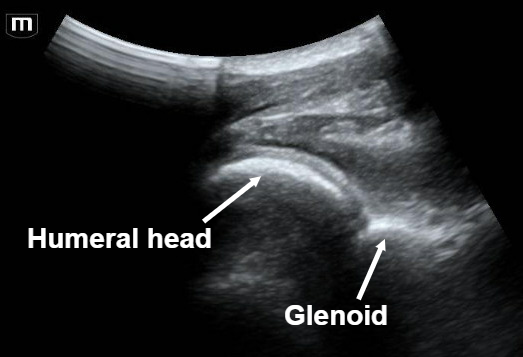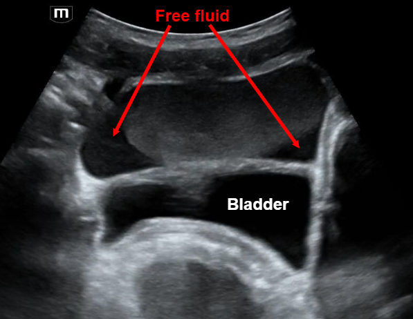 In this transverse view of the bladder, we can see free fluid above the bladder. See the attached clip to see this in real-time!