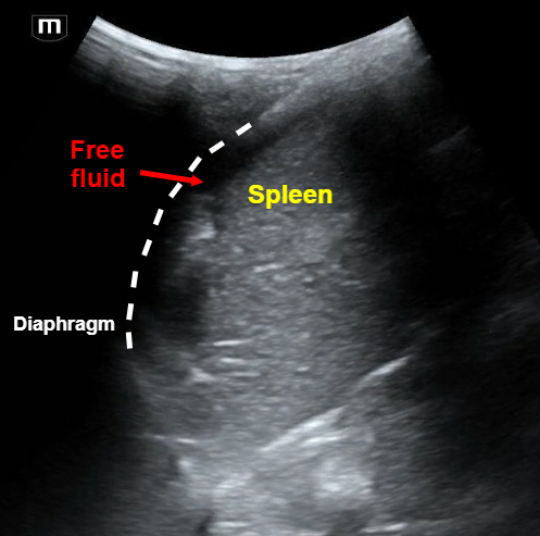 In this LUQ view, we can see free fluid between the diaphragm and the spleen. The diaphragm is highlighted with the dotted white line. Also note the abnormal spleen architecture; the spleen appears to have varying echo intensity with irregular borders and a hypoechoic rim. See the attached clip to see this in real-time!