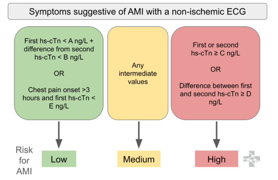 rapid rule-out of ACS with a non-ischemic ECG and either 1) one very low troponin result (depending on onset time of chest pain >3hrs) OR 2) very low change between two consecutive troponins (aka low delta troponin)