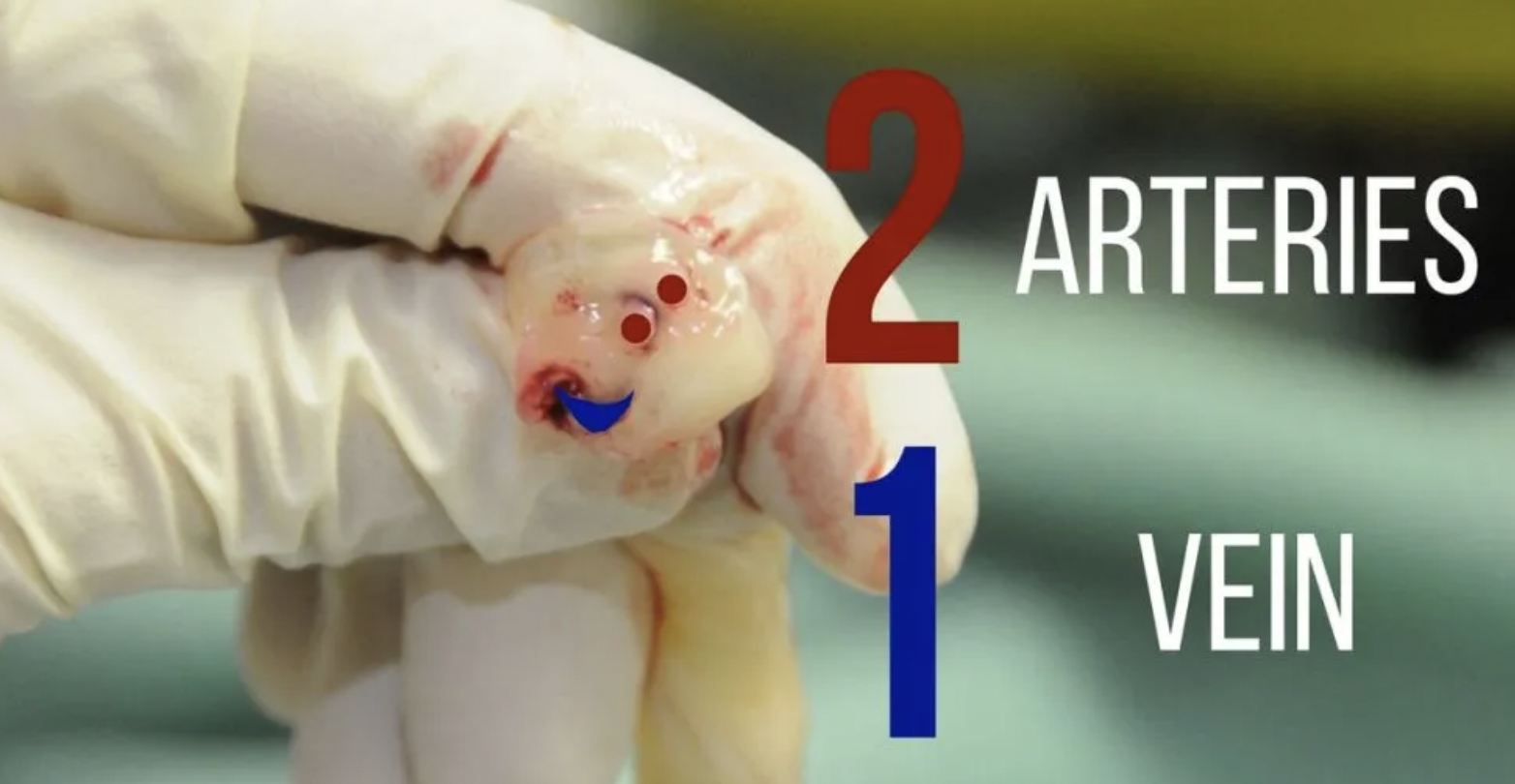 Identify the umbilical vein. The anatomy of the stump involves two smaller umbilical arteries and one umbilical vein. The arteries are typically smaller and thicker lumen, while the vein is larger and more collapsible (see below)