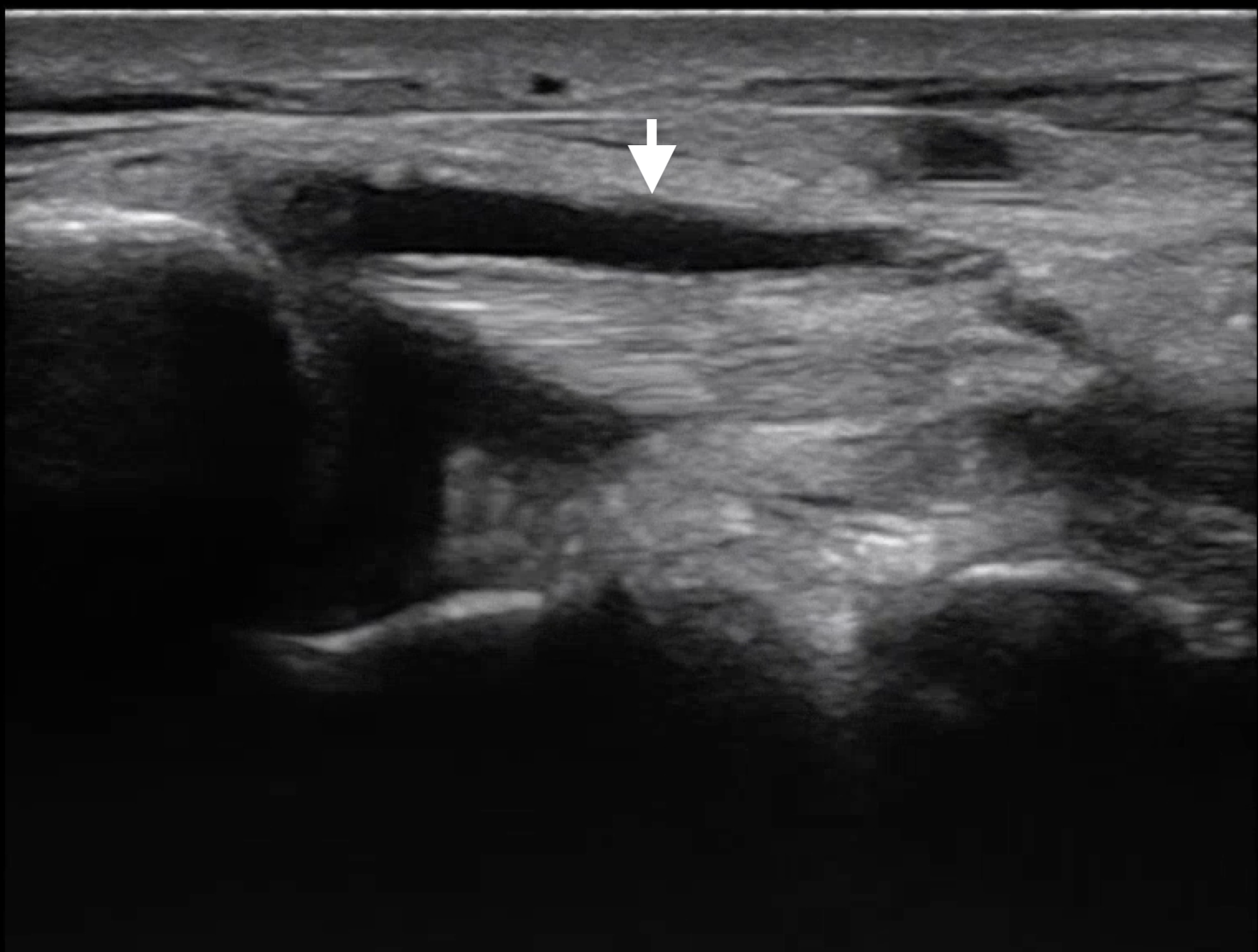 POCUS of the left lower extremity demonstrated no DVT in the femoral or popliteal veins, no abscess in the overlying soft tissue, and no joint effusion in the ankle. Fluid was noted surrounding the posterior tibial tendon, shown below in two planes.