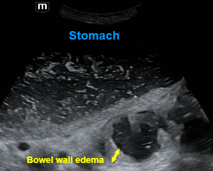 Note the transverse view of the small bowel below the stomach. The bowel wall appears thicker than normal, measuring 0.88 cm. Also note that the stomach itself appears very dilated!