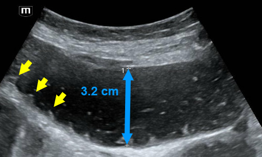83 y/o F with PMH esophageal hernia presented to the ED with 2 days of abdominal fullness, nausea, and vomiting. Last bowel movement was 2 days ago. Bedside ultrasound was done.