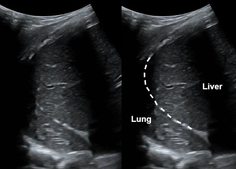 Shown above is the right hemidiaphragm or right upper quadrant view. We can see the liver and lung with the diaphragm (dotted line) in between. Note that the lung looks very similar in appearance to the liver! This liver-like appearance of the lung is called ‘hepatization’.